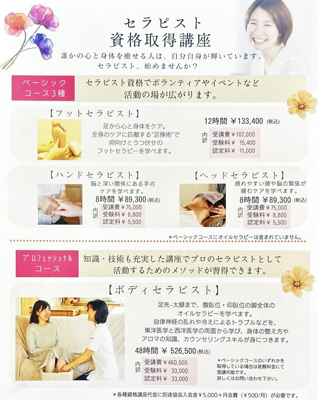 ※各種資格講座代金に別途協会入会金 ¥5,000+月会費(¥500/月)が必要です。